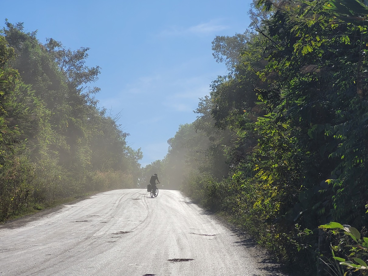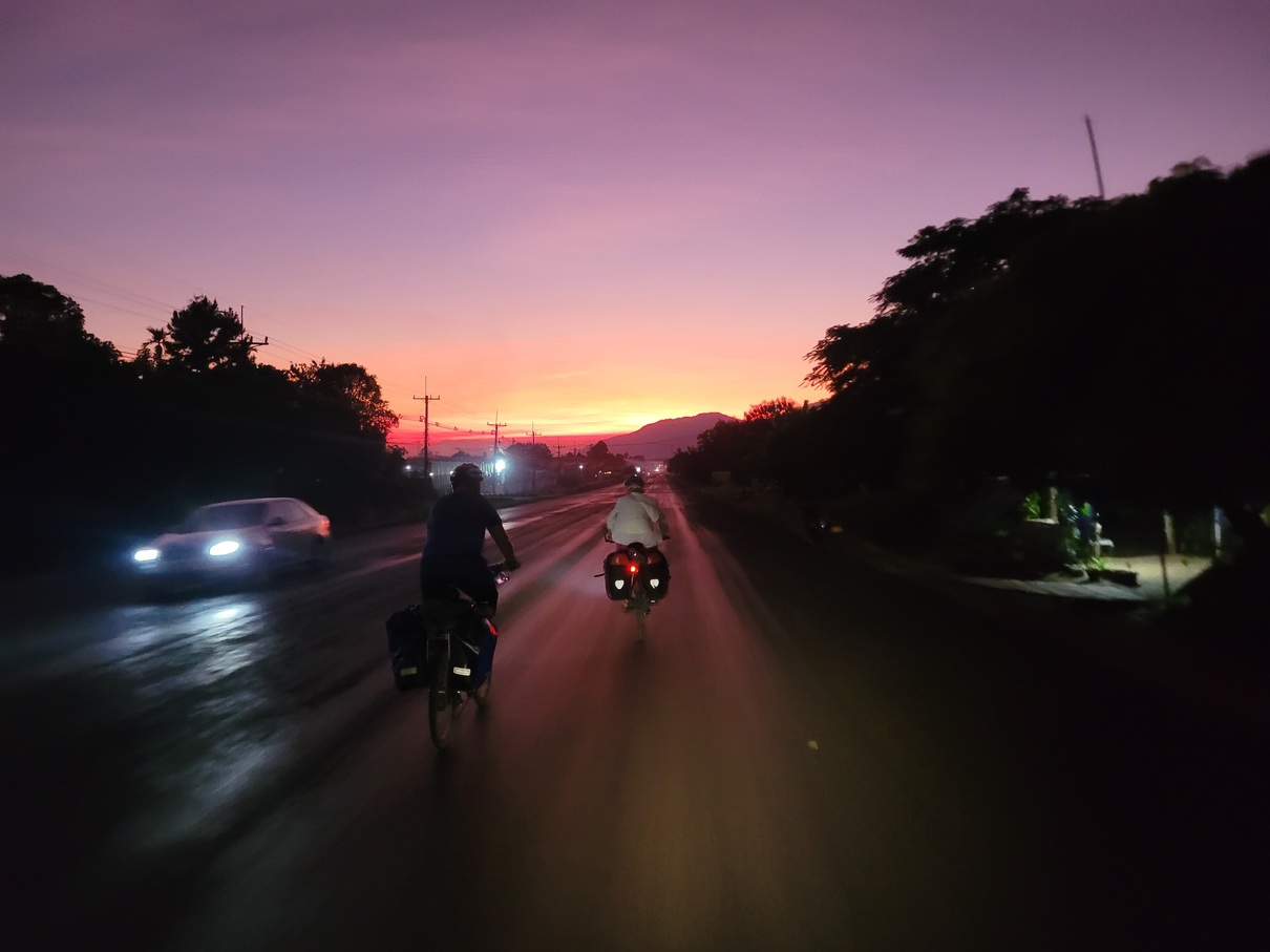Adam wyjechał chwilę wcześniej – jak mówi: sprawdzić jakość drogi oraz czy jest prom na dopływie Mekongu 15km dalej. Wysyłał potem niejednoznaczne komunikaty whatsappem („Jest drogowskaz na prom. Droga stała się gruntowa/ z płyt”) , a my po prostu jechaliśmy za nim w ciemno. Dokładnie w ciemno – dzień pomału się kończy.