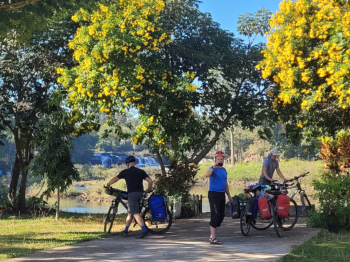Rano wstajemy o wschodzie słońca żeby zobaczyć kolejne wodospady. W odróżnieniu od tych co widzieliśmy wczoraj, to regularna atrakcja turystyczna – mimo wczesnej pory trzeba zapłacić bilet, ale wejście na mosty linowe nad wodospadami jest starannie zagrodzone – tam bilety sprzedają później (i dużo drożej). Jest okazale!