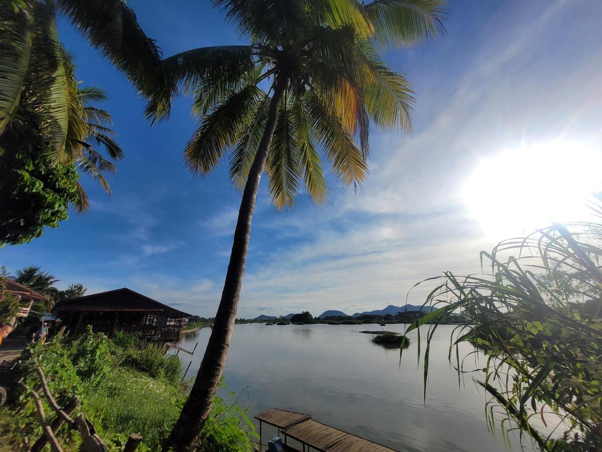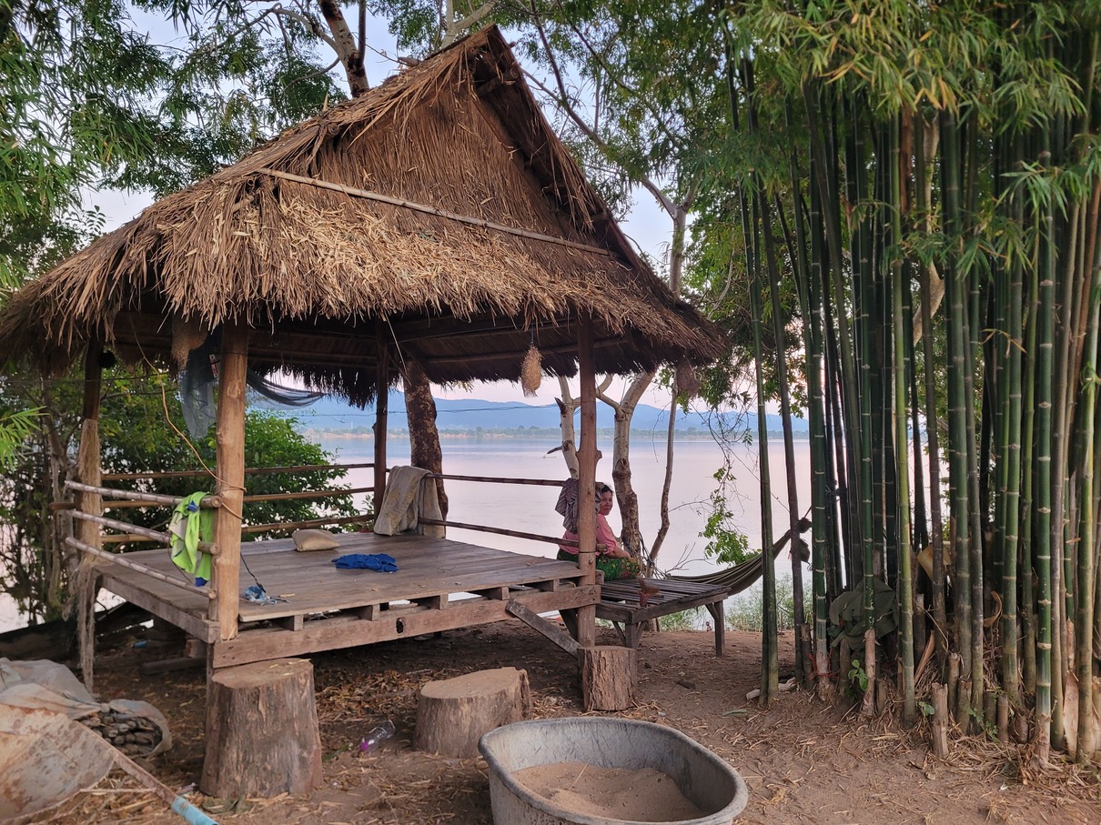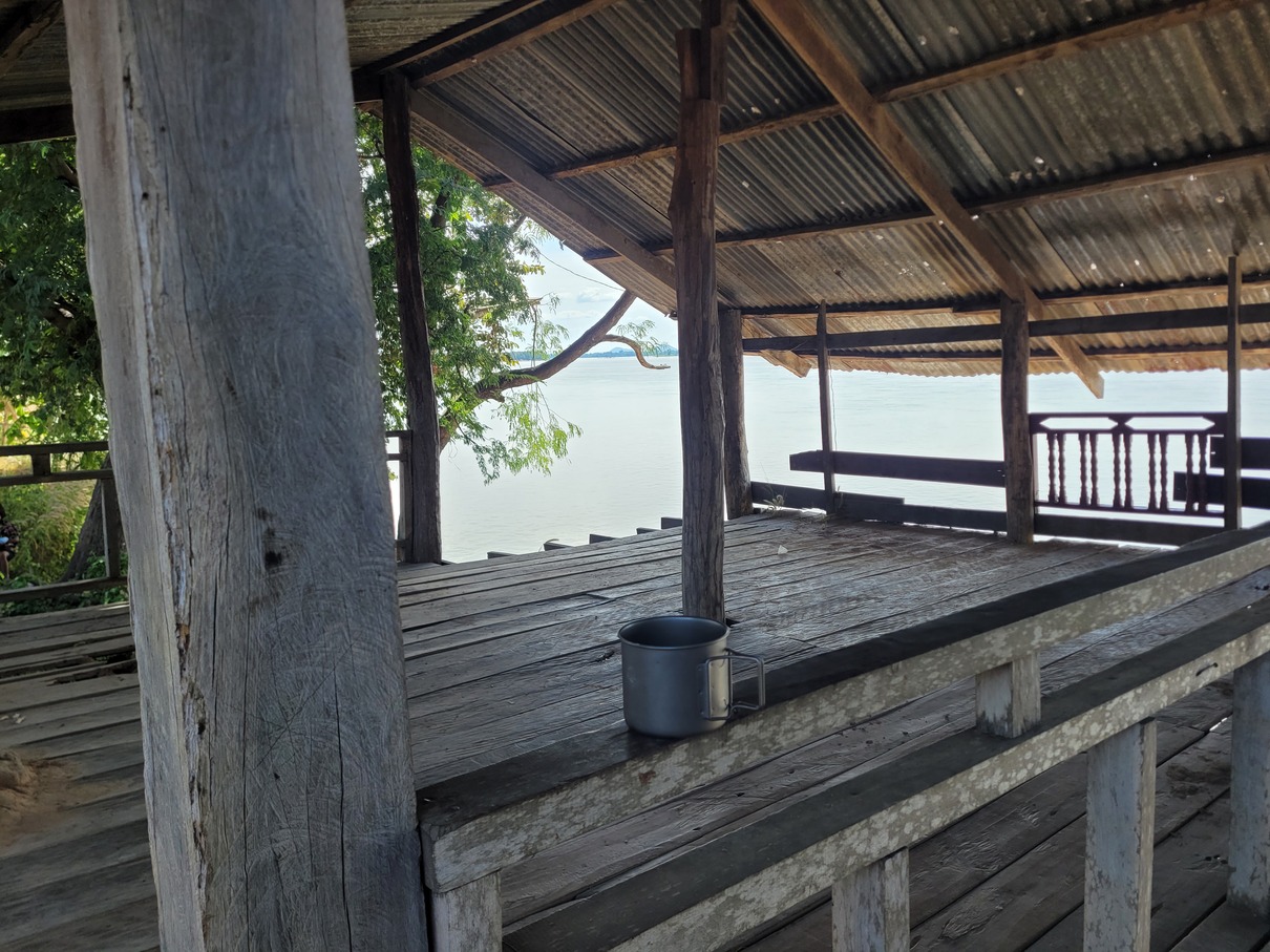 W zasadzie to nie mieli miejsca dla nas wszystkich, bo wolne mieli tylko 3 pokoje 2osobowe (z łazienkami!), ale zaraz obok pokoi jest piękny taras nad Mekongiem, gdzie aż się prosi rozłożyć sypialnię (moskitiera) namiotu. Wieczorne piwko nad rzeką smakuje znakomicie.