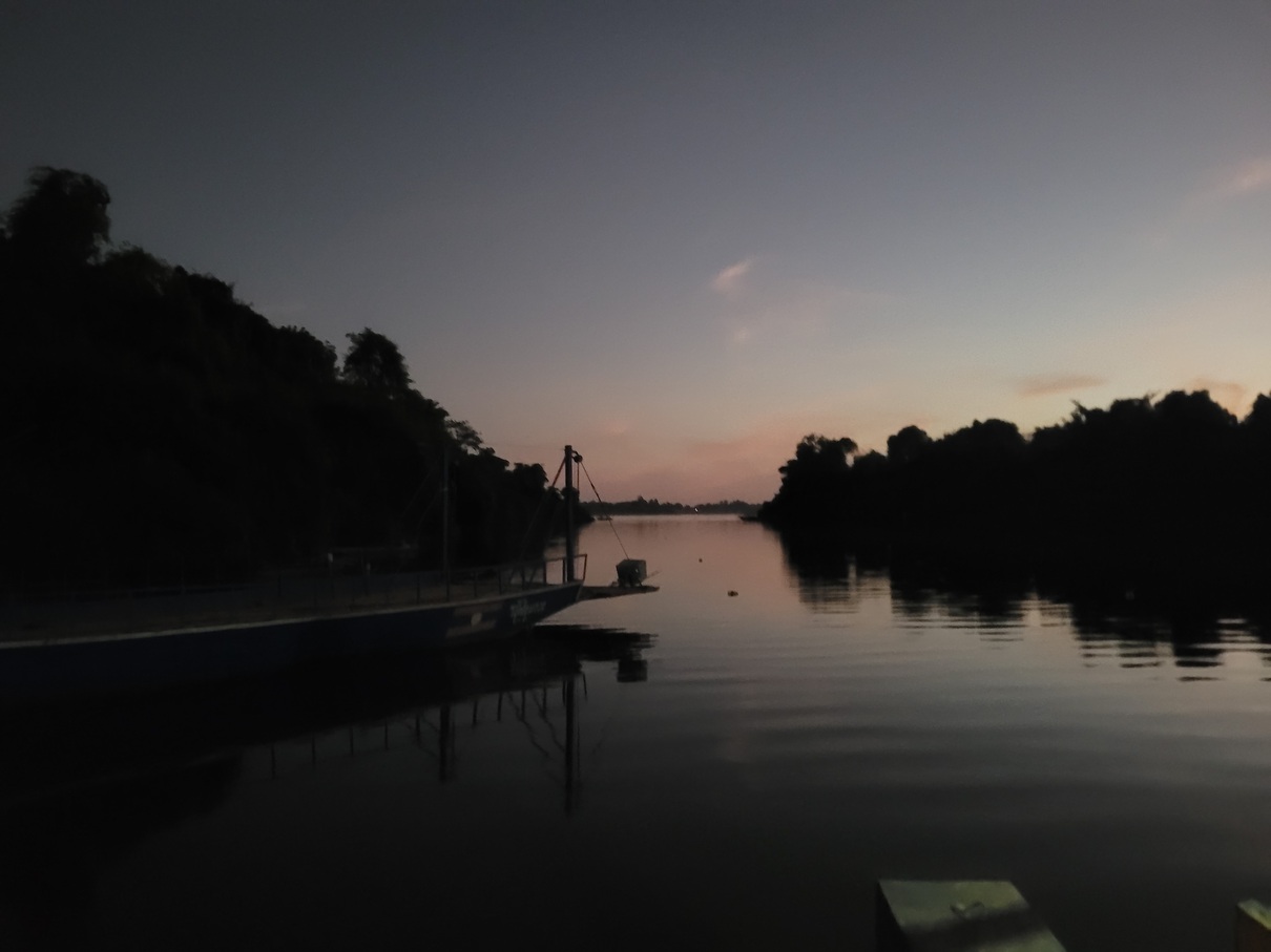 Przy promie chwila zwątpienia – już po zmroku, nikogo nie ma, jak my się przedostaniemy na drugą stronę? Ale wkrótce pojawiają się światła latarek, kilkoro dzieci, a zaraz potem i promowy – płyniemy.
